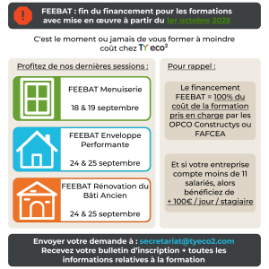 La fin des financements FEEBAT pour les formations avec mise en œuvre est annoncée pour le 30 septembre 2025.